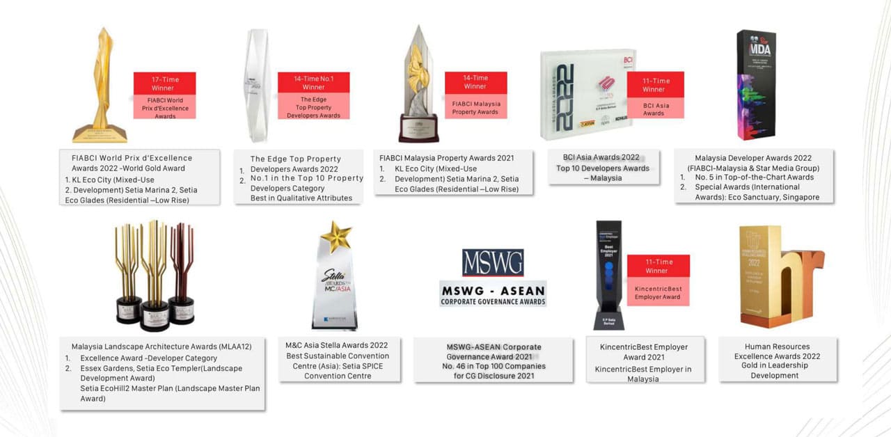 Là tập đoàn phát triển bất động sản số 1 Malaysia, Setia từ lâu đã trở thành cái tên quen thuộc đối với những giải thưởng bất động sản danh giá với kỷ lục hàng chục năm liên tục giữ vững thứ hạng. Tập đoàn đã có 17 lần chiến thắng tại giải thưởng quốc tế uy tín nhất mọi thời đại trong lĩnh vực bất động sản – FIABCI World Prix D’Excellence, 14 lần vinh quang tại giải Nhà phát triển bất động sản hàng đầu Malaysia do tạp chí Edge bình chọn, 17 lần đoạt cúp tại giải FIABCI toàn quốc Malaysia, 11 lần được trao tặng danh hiệu Nhà sử dụng lao động tốt nhất Malaysia do Kincentric bình chọn và hàng loạt giải thưởng khác.