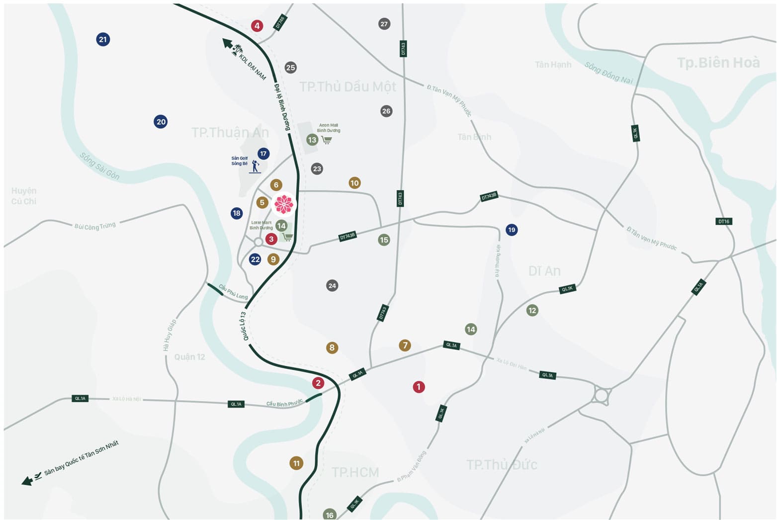 Vị trí Setia Edenia chính là một trong những lợi thế cạnh tranh vượt trội nhất, một “tọa độ vàng” được kiến tạo từ sự kết hợp hoàn hảo giữa kết nối hiện hữu và tiềm năng bùng nổ của hạ tầng tương lai. Tọa lạc ngay mặt tiền Quốc lộ 13, thuộc phường Lái Thiêu, TP. Thuận An, Setia Edenia không chỉ nằm tại trái tim của một trong những đô thị phát triển năng động nhất Bình Dương mà còn giữ vai trò là cửa ngõ chiến lược, kết nối trực tiếp và nhanh chóng đến TP. Hồ Chí Minh.
