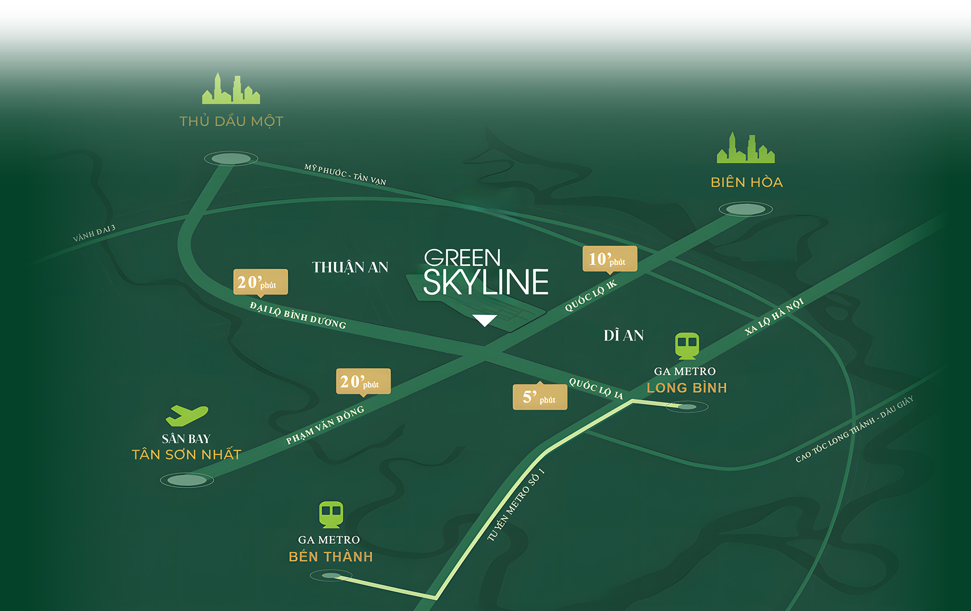 Green Skyline là khu căn hộ cao cấp được đầu tư và phát triển bởi TBS Land. Dự án được tọa lạc ngay vị trí góc Quốc lộ 1K và được GS1, thuộc khu đô thị Green Square, phường Đông Hòa, thành phố Hồ Chí Minh. Đây được đánh giá là vị trí kim cương đắt giá khi đã thừa hưởng được trọn vẹn hệ thống giao thông kết nối liên vùng hoàn hảo, cơ sở hạ tầng tiện ích ngoại khu hiện hữu.