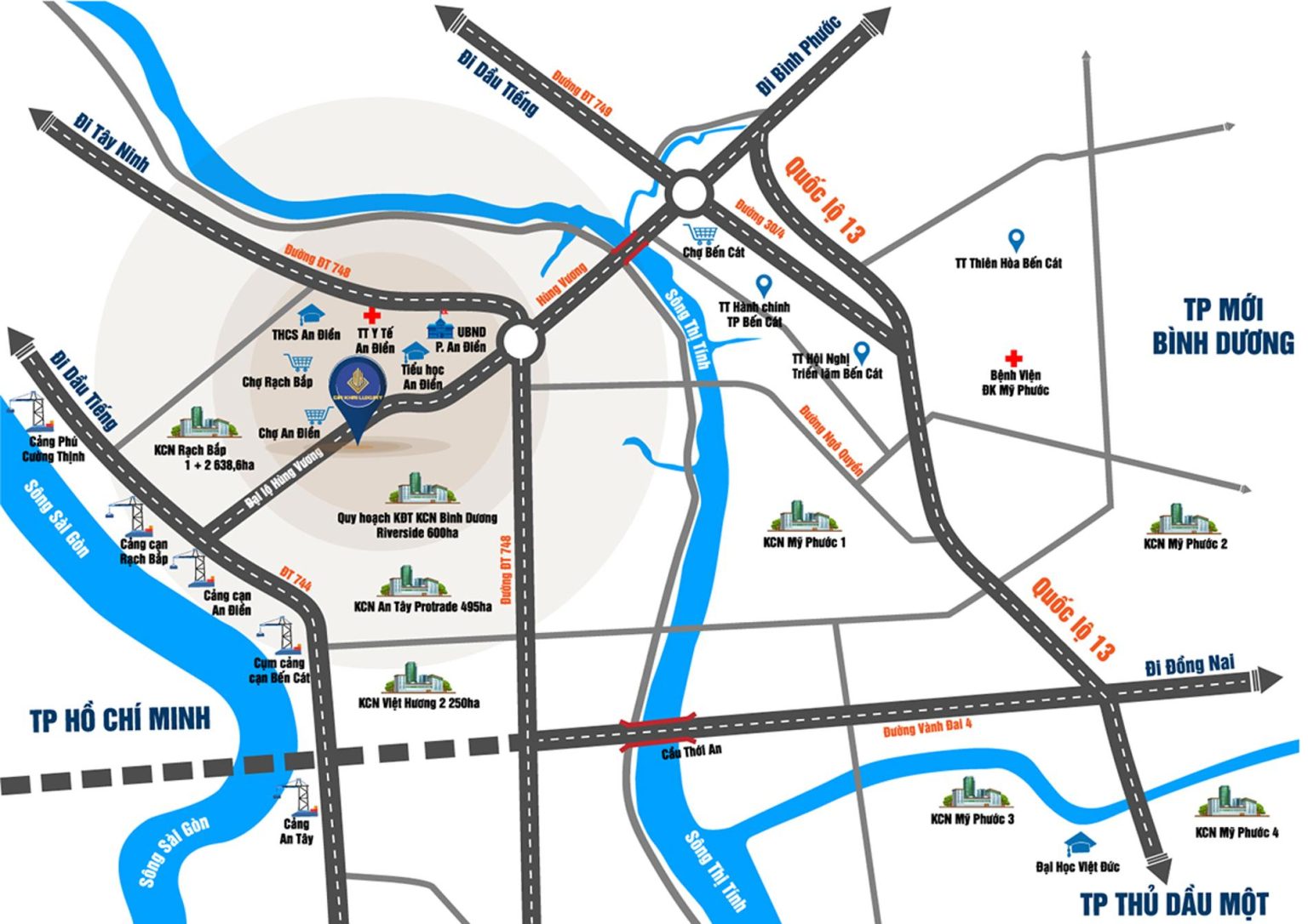 Vị trí dự án Khu nhà ở Gia Khải tọa lạc tại mặt tiền đường Hùng Vương lộ giới 40m, thuộc phường An Điền, TP Bến Cát. Đặc biệt dự án nằm trong khu dân cư sinh sống sầm uất, đông đúc, tiện ích hiện hữu đa dạng mang lại sức sống cao. Một nơi thu hút cư dân & chuyên gia đang làm việc tại các khu công nghiệp lân cận về an cư rất lớn. Chính vì vậy giúp cho nhà đầu tư khi sở hữu có tính thanh khoản tốt dành cho khách hàng Đây là vị trí đắc địa có dân cư hiện hữu và kinh doanh mua bán sầm uất nhất của khu vực, nhanh chóng kết nối qua tuyến giao thông huyết mạch Quốc lộ 13, Vành Đai 4, ĐT748, ĐT744…